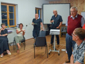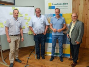 Bildtext: Bei der ersten Zukunftsrunde in Schönbach (von links): Regionalentwickler Josef Wallenberger, Leaderregions-Geschäftsführer Thomas Heindl, Hausherr der Klosterschulwerkstätten Franz Höfer und Leaderregions-Obmann Dieter Holzer.