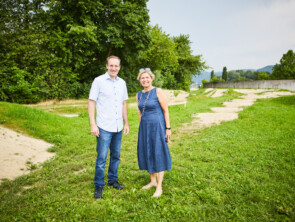 Bildtext: LEADER-Geschäftsführer Thomas Heindl und Dorferneuerungsvereins-Obfrau Christa Kranzl im neuen Bike-Park an der Donaulände in Persenbeug.